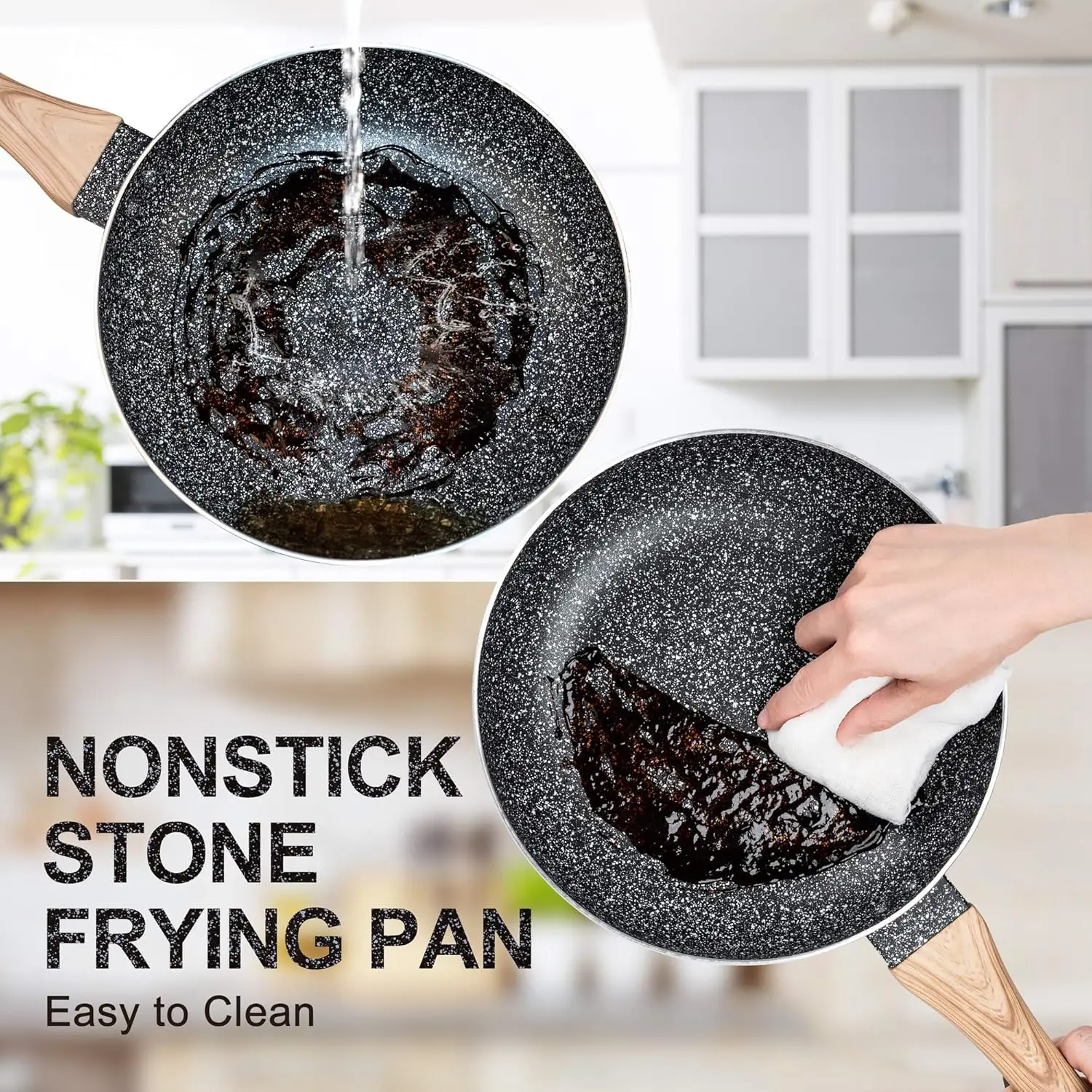 Rendimiento ultra antiadherente: Con su superficie de granito antiadherente, nuestras sartenes te permiten cocinar tus platos favoritos fácilmente, sin preocuparte de que la comida se pegue al fondo. Limpiar después es facilísimo, ahorrándote tiempo y esfuerzo en la cocina.