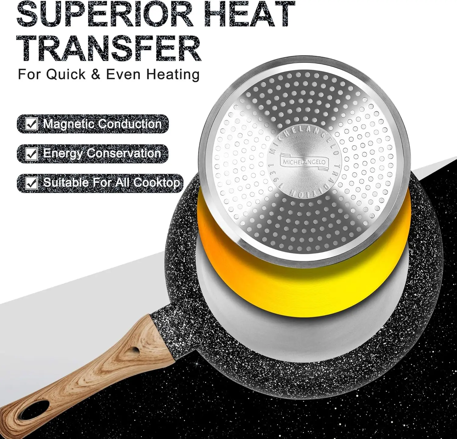 Calentamiento eficiente y ahorro de tiempo: La construcción profesional de aluminio de este juego de sartenes garantiza una distribución eficiente del calor, lo que resulta en una cocción rápida y uniforme. Esto no solo le ahorra un valioso tiempo de cocción, sino que también minimiza el consumo de energía.