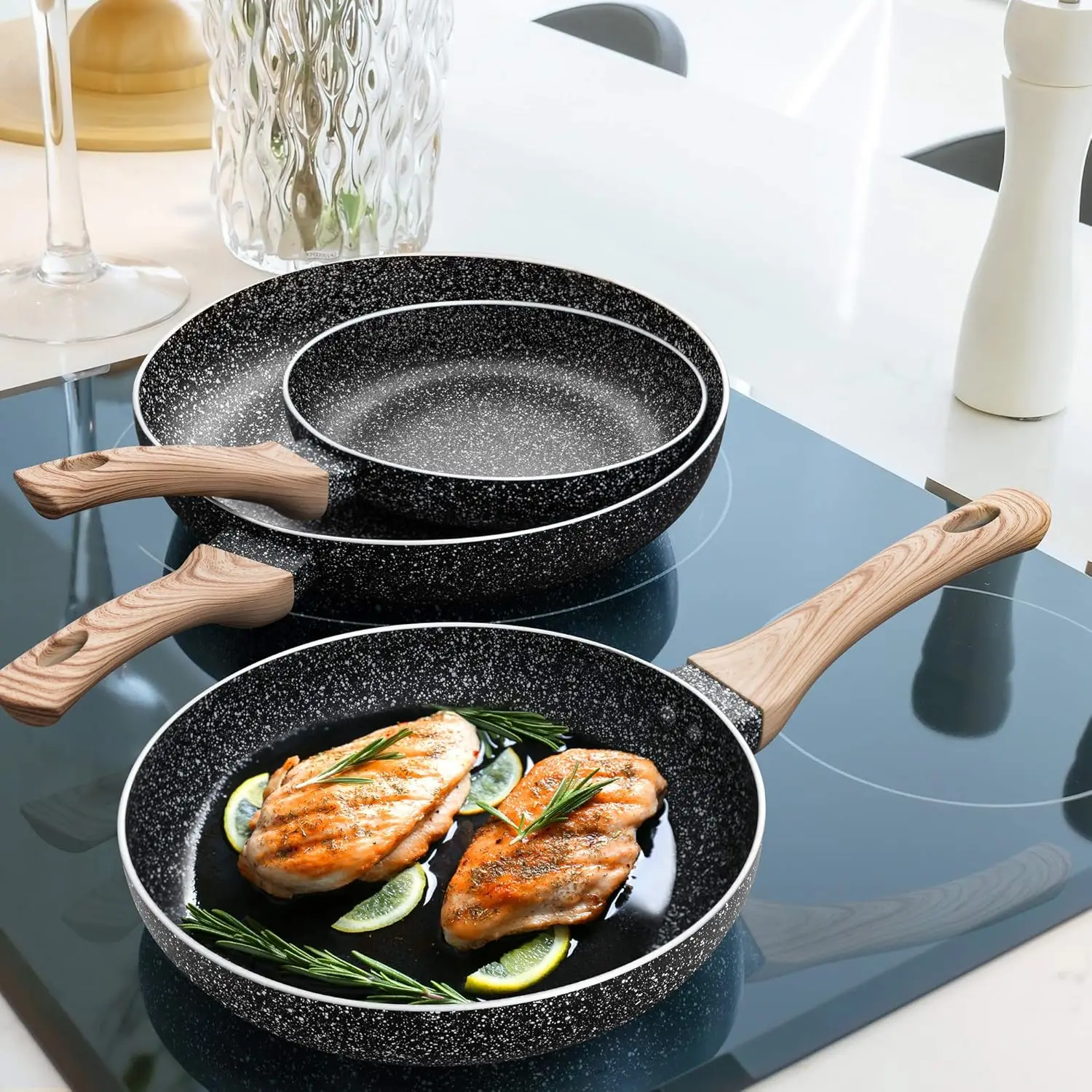 Versátiles y compatibles: diseñadas para satisfacer una variedad de necesidades de cocción, estas sartenes antiadherentes son adecuadas para usar en todas las estufas, incluidas las de gas, eléctricas, de inducción y de vidrio, lo que le brinda la flexibilidad de cocinar tortillas, salchichas, aves, hamburguesas o verduras y más en cualquier superficie de cocción.