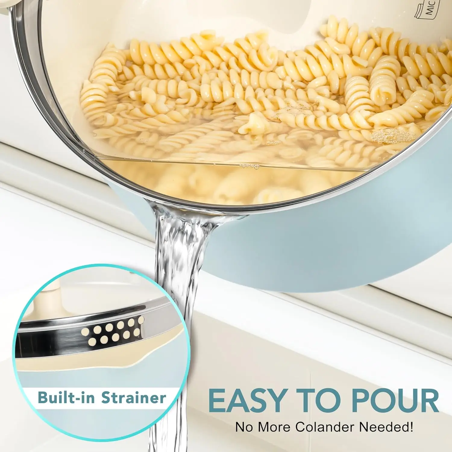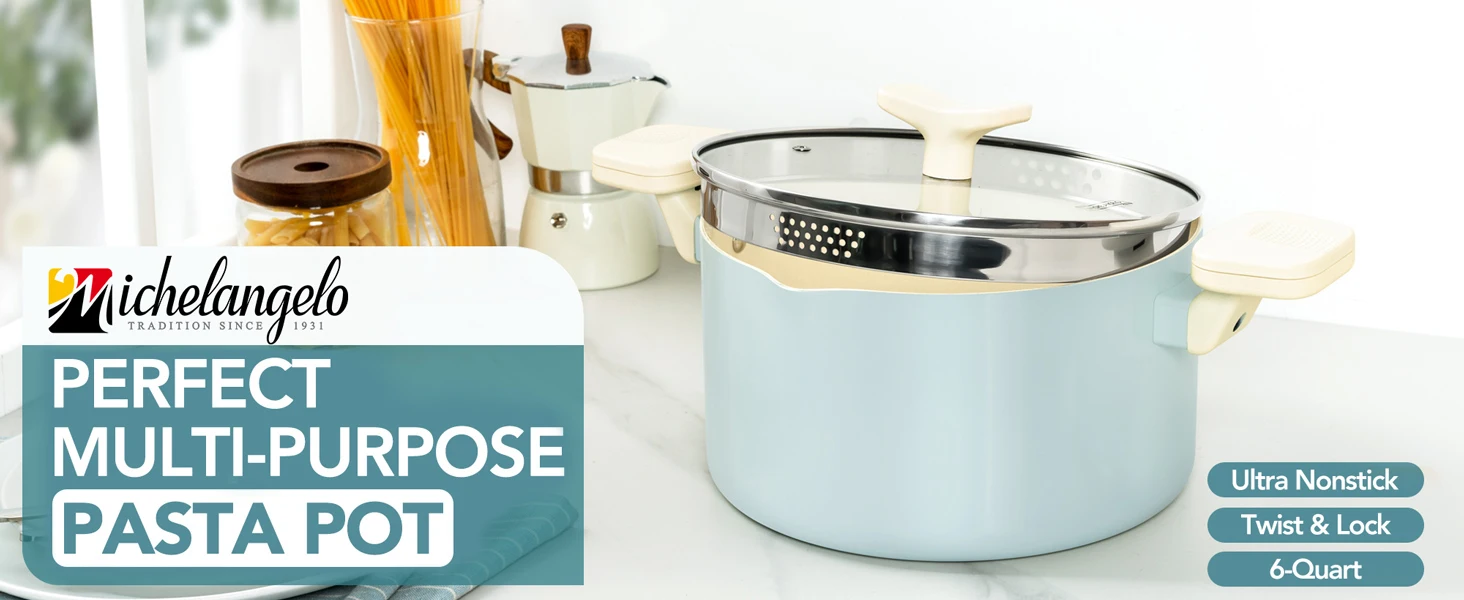 Easy Draining - Our pasta pot with built-in strainer lid drains spaghetti/pasta instantly through tempered glass lid’s holes. No extra colander. Rotating handles lock securely for spill-free pouring.